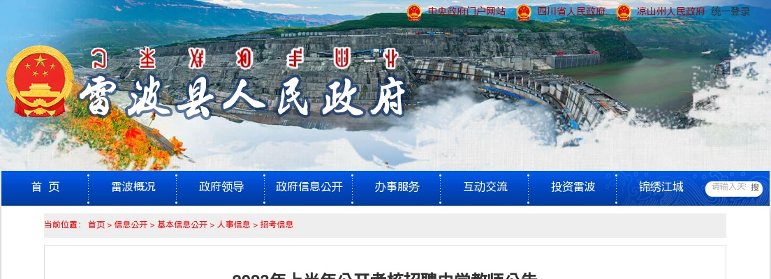 经县委、县政府研究同意,我县2023年上半年面向社会公开考核招聘中学教师52名,现将有关事项公告如下(本公告在雷波县人民政府公众信息网[http://www.lbx.gov.cn/]上发布):