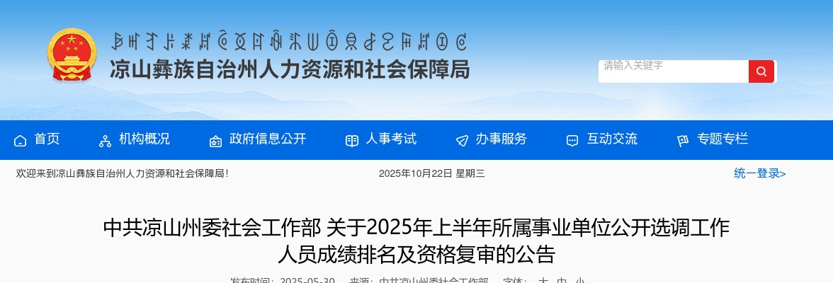 原标题:中共凉山州委社会工作部 关于2025年上半年所属事业单位公开选调工作人员成绩排名及资格复审的公告